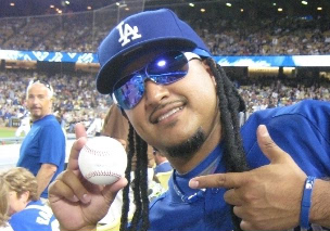 Decked out in full Manny attire, Mannywood has attended nearly every Dodgers game this season, snagging 100 balls in the process. His 100th ball came this past Saturday on a ball thrown from the Dugout by Matt Kemp. Kemp has been particularly generous to Mannywood this season, hooking him up with 4 thrown balls and 4 batted balls.