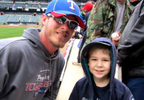 To earn four points, Tim had to pose with a Rangers player (Mark Lowe) while wearing Mariners gear.Todd Cook and sons, last year's winner of the myGameBalls.com Photo Scavenger Hunt, are wasting no time in racking up points in this year's contest. Just a month and a half into the season they've already recorded 52 points out of a possible 130, putting them in first place by over 40 points.