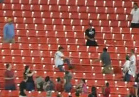 Gold (center, white jersey), hurdles a row of seats in pursuit of the Morrison home run ball.Sun Life Stadium is down to its waning hours in the baseball world, and for most people that's a good thing. It's never been a popular stadium, and most fans are glad to put it on the shelf in favor of the Marlins' brand new ballpark that will open next season.